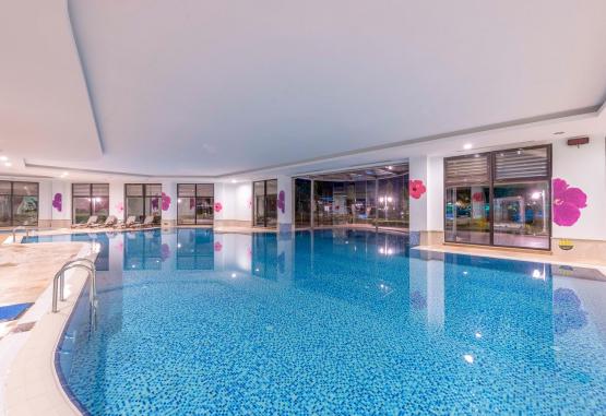 Spațiul cu 8 piscine exterioare și o piscină interioară se potrivește de minune pentru odihnă activă și antrenamente regulate în apă. Cei mici se pot bălăci în zona de scăldat amenajată pentru copii. Senzații tari pe toboganul de apă, băuturi răcoritoare la barul piscinei și relaxare agreabilă a mușchilor în cada cu hidromasaj – piscina oferă ceva potrivit pentru orice dispoziție și energie. Clienții își pot savura concediul pe terasa însorită cu șezlonguri și umbrele. Satul de vacanță oferă un program cuprinzător de sport în aer liber cu tenis, boccia, volei de plajă, baschet și tir cu arcul. Și iubitorii sporturilor acvatice se vor simți minunat datorită unor activități precum schi nautic, windsurfing, plimbări cu scuterul acvatic, hidrobicicletă, plimbări cu banana, canoe, catamaran și aqua-fitness. În complexul cu o sală de fitness, tenis de masă, biliard, un joc de darts, bowling și aerobic, clienții pot alege dintr-o serie cuprinzătoare de activități sportive în interior. La locul de cazare sunt propuse diverse oferte de relaxare, ca de exemplu spa, saună, baie de aburi, hamam, salon de înfrumusețare și terapii prin masaj. În timpul liber, un program de recreere, un miniclub, o minidiscotecă, muzică live, o discotecă și un club de noapte oferă distracție pe măsură. Copyright GIATA 2004 - 2023. Multilingual, powered by www.giata.com for client no. 128259
