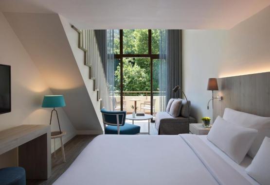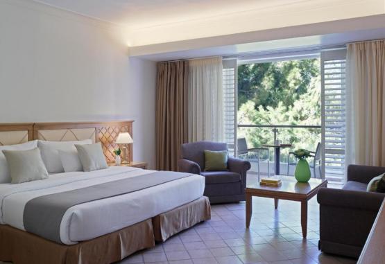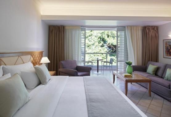 Camerele au balcon cu vedere la golful Ixia sau la pădurea de pe deal. Fiecare unitate de cazare include aer condiționat, seif, TV prin satelit și minibar. Se asigură papuci și halate de baie din partea casei.