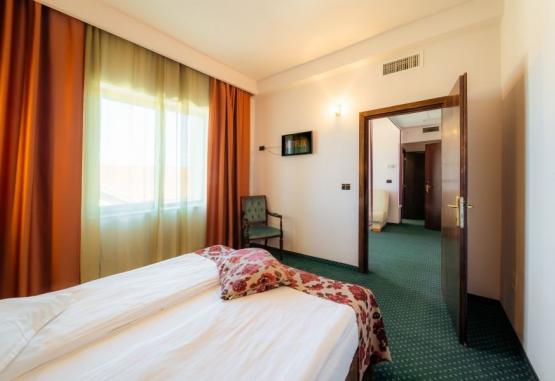 cablu, pat dublu, baie cu dus si bideu. Camera dubla permite adaugarea unui pat suplimentar, la cerere.Intr-o camera se pot caza maxim 2 adulti si un copil!Patutul pentru bebelus este gratuit, in numar limitat si se ofera in limita disponibilitatii.Apartament - suprafata 40 mp, format din living si dormitor, dotat cu internet,