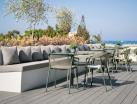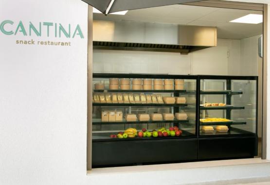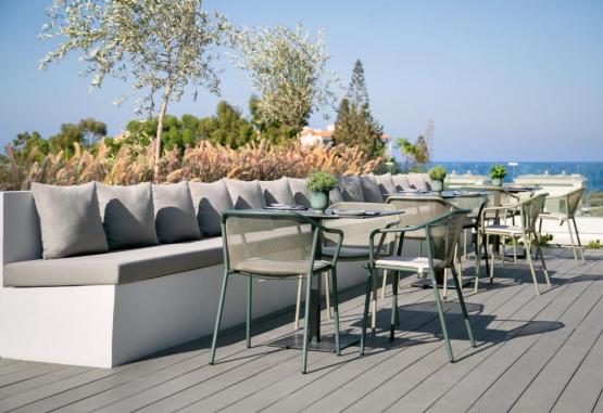 La proprietate puteți savura un mic dejun tip bufet, continental sau vegetarian. Atlantica Aqua Blue are un restaurant care servește mancăruri din bucătăria grecească, mediteraneană și internatională. La cerere, sunt disponibile și preparate vegetariene, fără lactate și vegane.