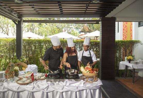 Palm Court beneficiază de o curte umbrită si zonă de luat masa in interior și oferă bufet cu preparate internaționale si cine tematice. De asemenea, există 2 baruri, iar serviciul de room service este disponibil intre orele 06:30 și 23:30.
