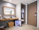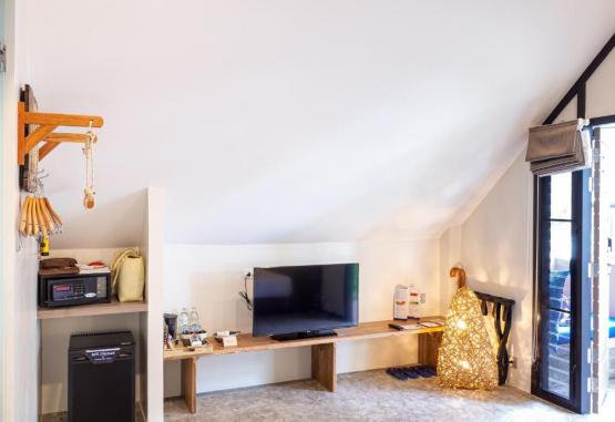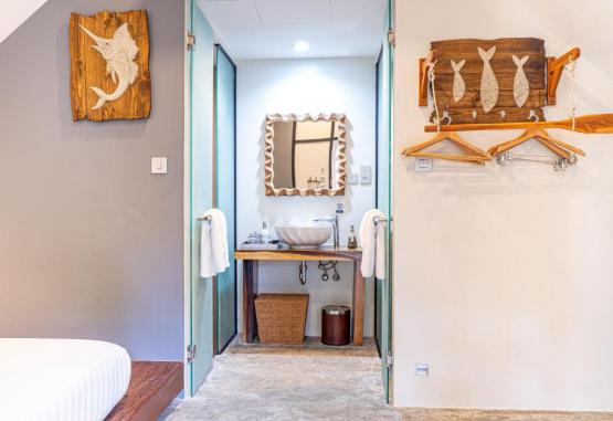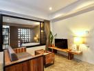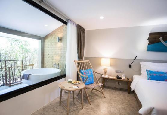 The earth-tone with tints of blue rooms are all air-conditioned and have a privacy balcony that overlooks the garden. The spacious bathrooms are fitted with fluffy towels, bathrobe, complimentary luxury toiletries and a rain shower. Selected room types also come with a separate outdoor bathtub.
