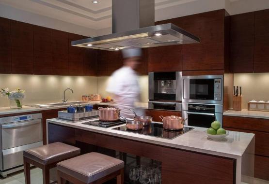 Oaspeții de la The Ritz-Carlton au la dispozitie diverse restaurante tematice, unde pot savura mancăruri asiatice, arăbești și mediteraneene, precum si noul restaurant Palm Grill de pe plajă, care oferă vedere la golful Persic.