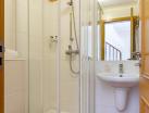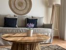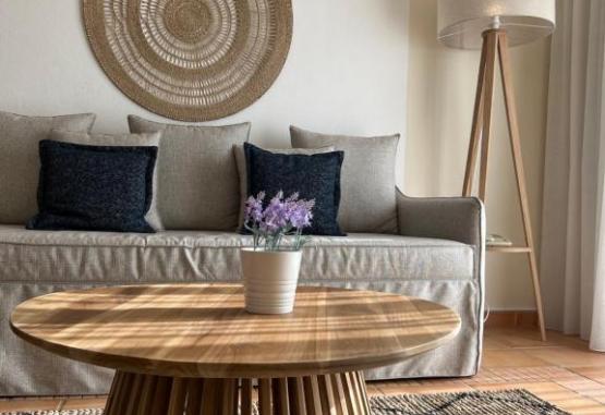 Fiecare unitate de cazare are un lounge amenajat rustic cu o canapea din pluș și mobilier ornat din lemn.