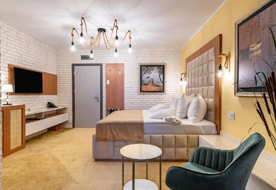 compus din dormitor si living, dotat cu pat matrimonial si canapea extensibila,