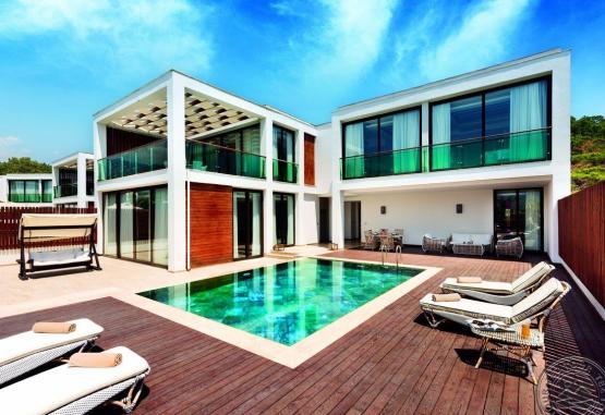 - 4 superior villa cu 2 nivele (piscina individuala si gradina, la primul nivel: dormitor, living, bucatarie americana, baie; la nivelul doi: 3 dormitoare cu usa (un dormitor cu dressing si baie), max. 8 pers., 300 m2, servicii VIP).