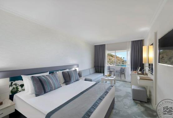 - 6 deluxe suite cu doua camere (living, dormitor cu usa, 2 TV, vedere la mare, max. 2 pers., 100 m2);