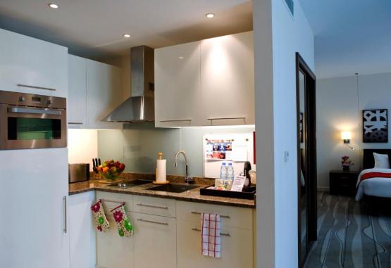 The Staybridge Yas Island’s air-conditioned accommodation has large windows and white linens on the plush beds. They all come with a fully equipped kitchen, a seating area and a 32-inch satellite LCD TV.