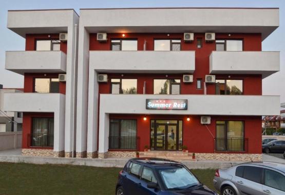 Vila Summer Rest este situata in Mamaia Nord la doar 3 minute de mers pe jos pana la plaja si 5 minute pana la Lidl. Este situata la aproximativ 400 de metri de plaja, in proximitatea plajelor Mackarel si Manor. Vila Summer Rest este structurata pe parter si trei etaje, din care ultimul a fost construit in 2023, punand la dispozitie camere duble, o camera tripla si doua apartamente (pe etajul cel nou). Va informam ca incepand cu sezonul 2023, se va incasa la receptie in momentul cazarii taxa de statiune, reprezentand 1% din valoarea tarifului de cazare fara T.V.A, pentru fiecare noapte de cazare conform HCL NR. 02/10.02.2022.Dotari si serviciiDispune de gradina si de foisor amenajat cu fotolii si mese.Parcare privata a vilei Summer Rest este gratuita, in limita disponibilitatii.Dotari camereToate camerele au balcon si sunt dotate cu AC, frigider, televizor, baie proprie cu dus si uscator de par. Camera tripla dispune de 3 paturi twin (90x200), aer conditionat, LED tv, wi fi, minibar, baie cu cabina de dus, cosmetice hoteliere si uscator de par, plase de tantari, podele de gresie, balcon. Este situata la etajul 2. Suprafata 22 mp.Apartamentele sunt situate la etajul 3, sunt amenajate in 2023 si se compun din living cu canapea extensibila si bucatarie open space echipata cu vesela, plita, masina de spalat rufe, dormitor matrimonial (pat de 160x200), baie dus modern walk in, cosmetice hoteliere si uscator de par, balcon. Apartamentul e dotat cu mobilier nou, frigider, plase de tantari, podele de gresie si internet wireless. Exista usa la dormitor, iar aer conditionat si LED tv se afla in ambele camere. Suprafata 45 mp.