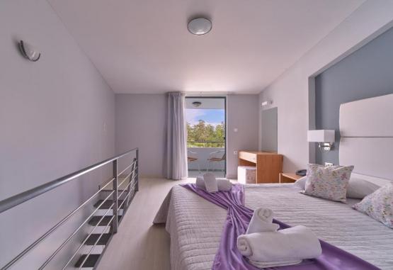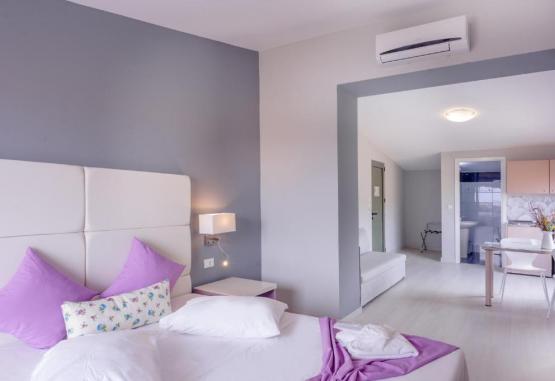 Facilități cameră - Studio superior: Suprafata camerei 28 m², balcon cu vedere la piscină, chicinetă, baie privată cu cadă, articole de toaletă gratuite, uscător de păr,