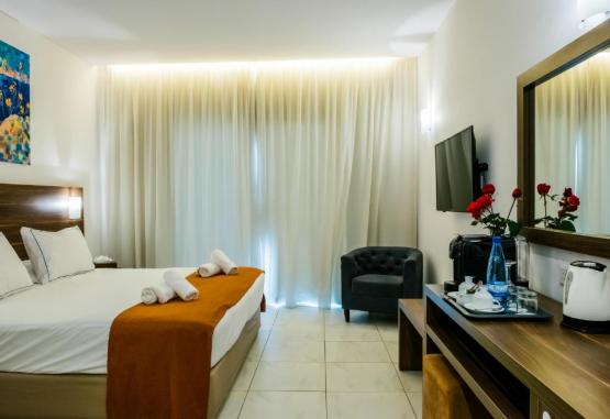 Toate camerele de la Hotelul Theo Sunset Bay au TV cu ecran plat montat pe perete și balcon mobilat.