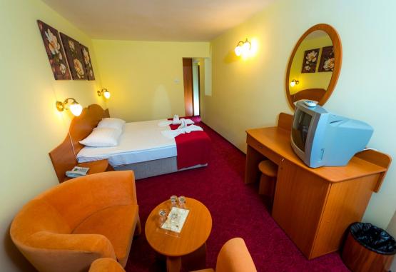 Localizare:Hotelul Parc beneficiază de o poziționare privilegiată, intr-o zonă inconjurată de verdeață, in nordul orașului Buziaș, oferind avantaje atat oaspeților cu preocupări in domeniul afacerilor, celor sosiți pentru tratament sau relaxare, cat și persoanelor dornice să viziteze și să cunoască locurile.Hotelul Parc pune la dispoziție 140 de camere. Din care, 136 de camere - model twin 109 și 27 cu pat matrimonial și 4 apartamente.Cazare:Camerele dispun de acces pe bază de card magnetic si baie cu cadă.Hotelul dispune de parcare păzită pe durata nopții in limita locurilor disponibile.Clientii vor descoperi in Complexul Hotelier Parc*** un partener de incredere in organizarea diverselor evenimente, descoperind un complex cu infrastructura necesară pentru organizarea acestora. Infrastructura presupune sală de conferințe complet dotată și echipată, acces internet wireless, capacitate 80 de locuri.Servicii Masa:Restaurantul vă oferă o gamă largă de servicii pentru toate ocaziile, reprezentand garantia unei inalte calităti gastronomice, flexibilitate deplină in alcătuirea meniului, cat si adaptarea lui la bugetul dumneavoastră. In sensul acesta lucrează o echipă de profesionisti sub deviza, "respect pentru clientii nostri".