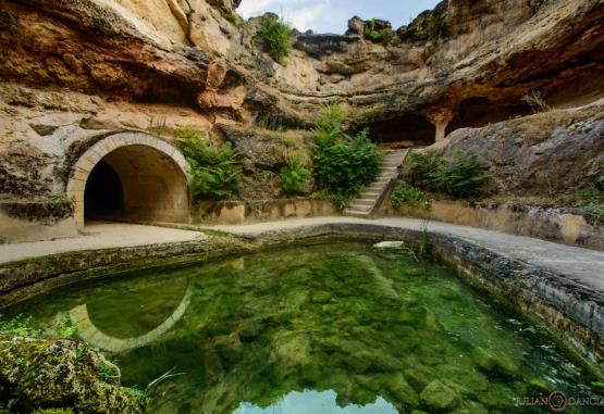 de tratament dispusa pe doua nivele. La parter: 2 piscine cu apa termala, sauna, baile la cada si cabinetul